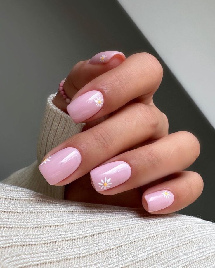 In photo presents nails that are the epitome of spring’s gentle touch—a soft blush pink background adorned with small, delicate daisies, creating a look of serene beauty.