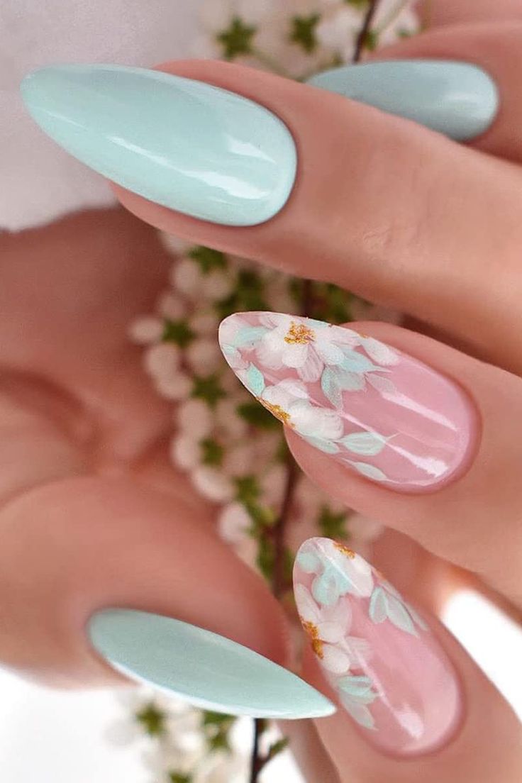 Lastly, photo takes us on a journey through a garden of floral designs paired with pastel hues, perfectly encapsulating the spring nail color trends of 2024. The combination of mint green, soft pink, and floral art creates a symphony of spring nail colors that’s both simple and elegant.