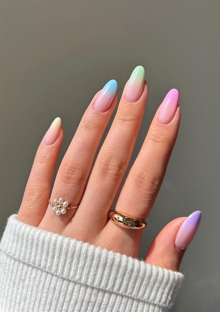 Moving on to a softer spectrum, photo presents a pastel rainbow that captures the essence of spring nail colors by skin tone range. Each nail dons a different pastel shade, creating a harmonious rainbow that suits any skin tone and adds a touch of elegance to your look.