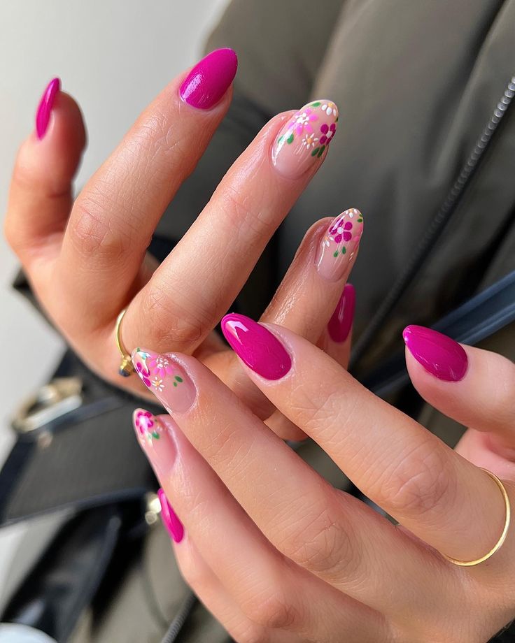 Last but not least, photo takes a bold step with a magenta that’s as lively as the season itself. Paired with a transparent base adorned with floral designs, this style is for those who love to make a statement with their spring nail colors.