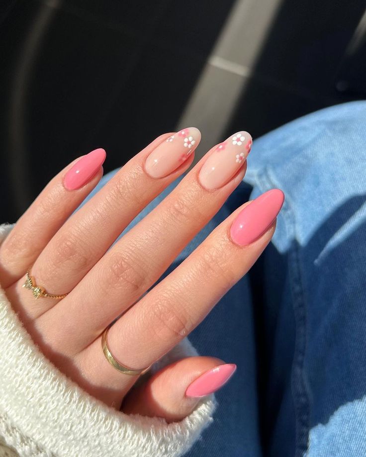The nails alternate between a full-cover bubblegum pink and a transparent base with white floral accents. This contrast offers a fresh take on the spring nail colors, providing a cute and simple aesthetic that is perfect for the season.