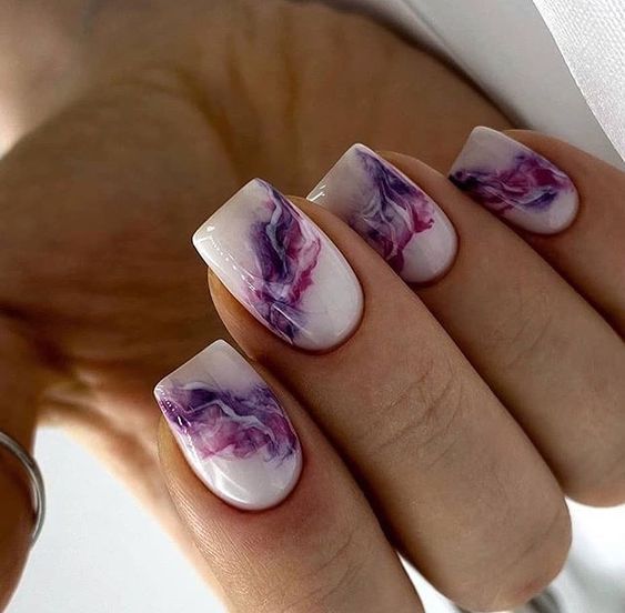 The captivating swirls of white and purple on a clear base in photo are reminiscent of marble sculptures, offering a touch of luxury and artistic flair to the wearer’s fingertips.