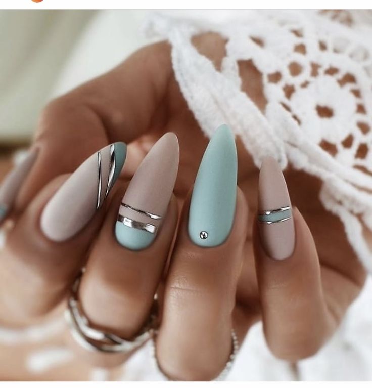 Geometry meets glamour in these spring nails coffin shape designs. The interplay of pastel hues with bold, precise lines exudes a modern, chic vibe. Adorned with metallic accents and a gemstone here and there, these nails are a testament to the playful side of spring – where structure and fun coexist harmoniously.