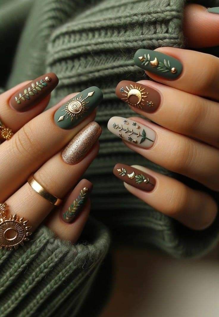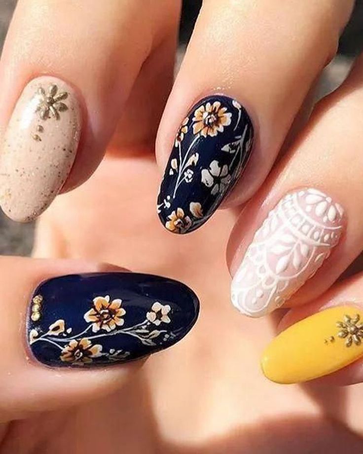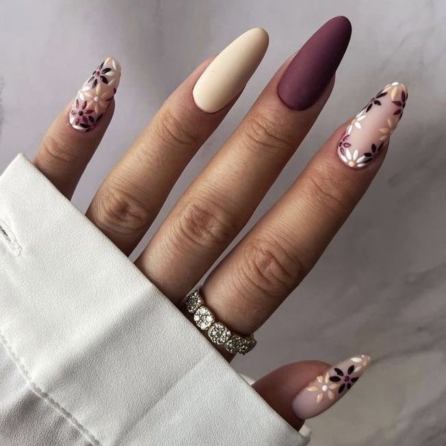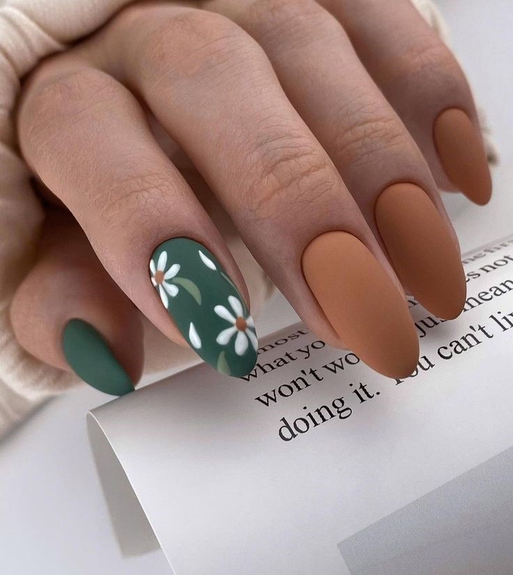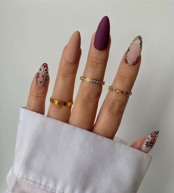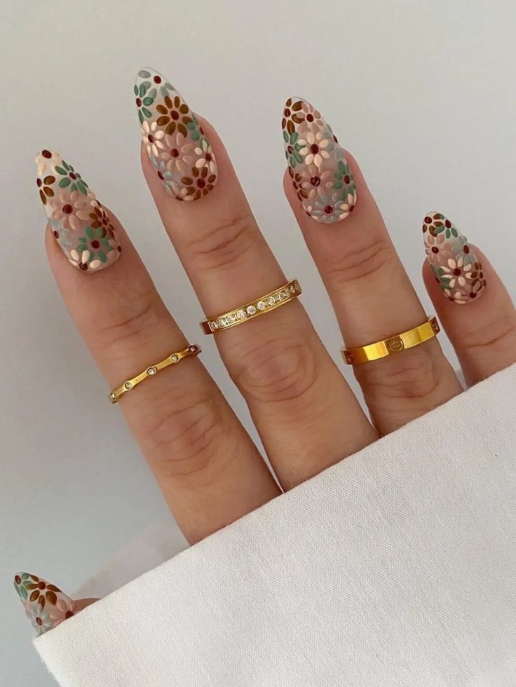 Who says spring can’t have a touch of autumn? These spring nails coffin acrylic feature a harmonious blend of fall colors in spring-inspired floral patterns. It’s a unique fusion that stands out in a sea of typical spring designs, perfect for the woman who loves to mix and match seasonal elements.