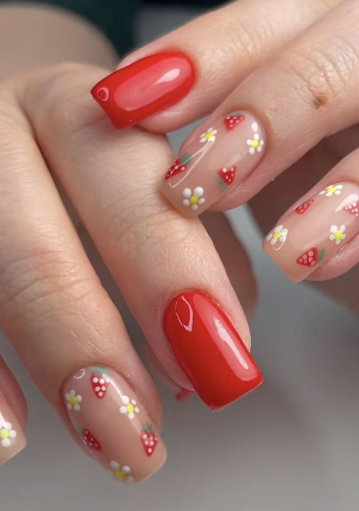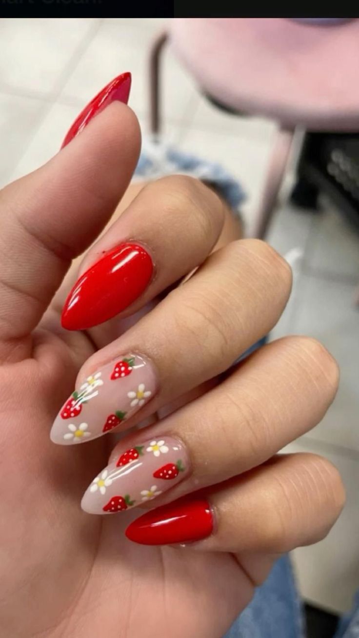Nothing says spring like fresh strawberries. The spring nails red design with strawberry patterns brings a touch of cute and fun to your fingertips, reminiscent of sunny days and picnics in the park. It’s a playful twist on the red theme, perfect for the young at heart.