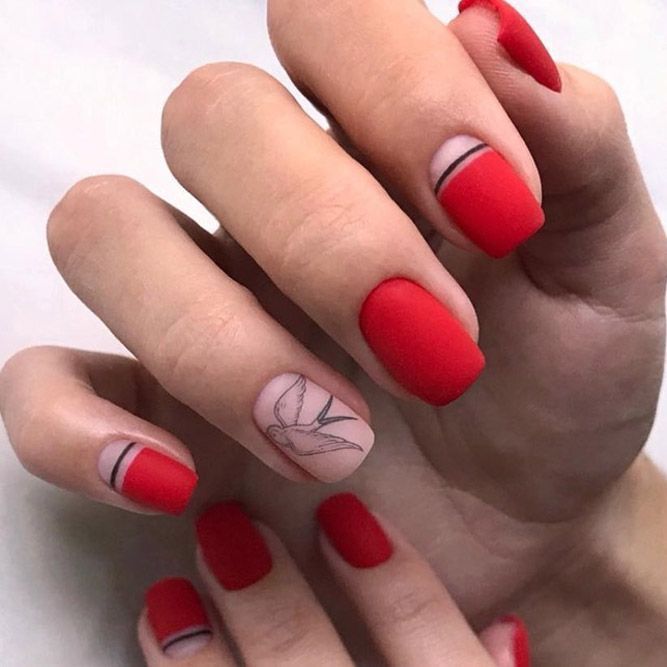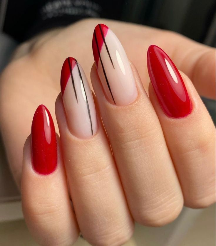 For the lovers of sharp lines and bold statements, here comes a design that marries spring nails red with geometric precision. The sleek red lines over a transparent base are a testament to trendy design and minimalist aesthetics, appealing to a sense of modern sophistication.