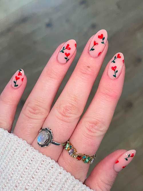 Spring is synonymous with blooming flowers, and what better way to welcome it than with spring nails red flowers? This design features delicate floral patterns in a lush red on a nude base, evoking the beauty of a garden in bloom. It’s a nod to nature’s awakening, ideal for the woman who appreciates cute and acrylic designs with a touch of femininity.
