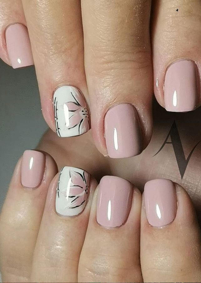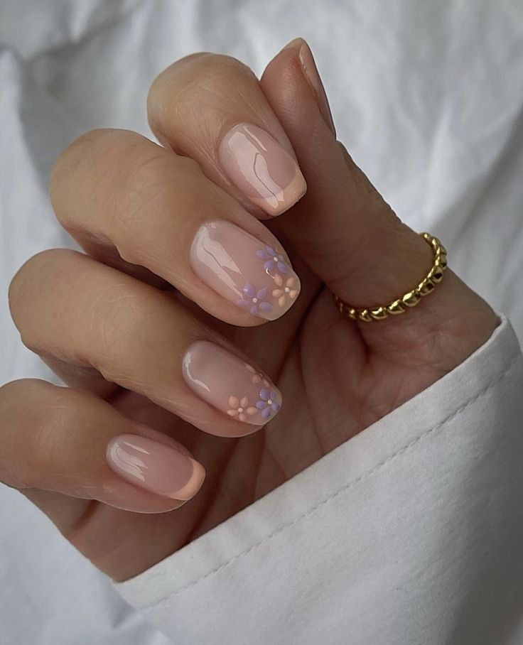 This short gel nails summer bright designs suggestion whispers of lavender fields in bloom, with a sheer nude base and subtle purple flower accents. It’s a testament to how gel polish nail designs on natural nails summer can bring the outdoors in.
