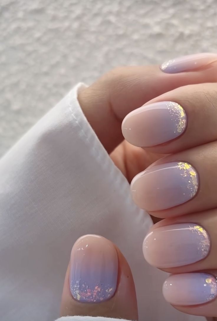 Whisper soft and dreamy, this design takes the understated elegance of a sheer pink base and elevates it with a dusting of gold and silver glitter that fades into the fingertip, like a sunset dipping into the horizon.