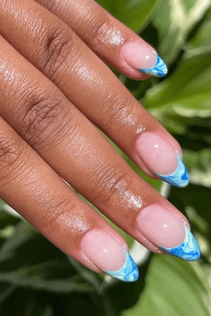 - I’d recommend ‘Seaside Serenity’ for the blue and ‘Blush Whisper’ for the soft pink to achieve these summer vacation nails almond.