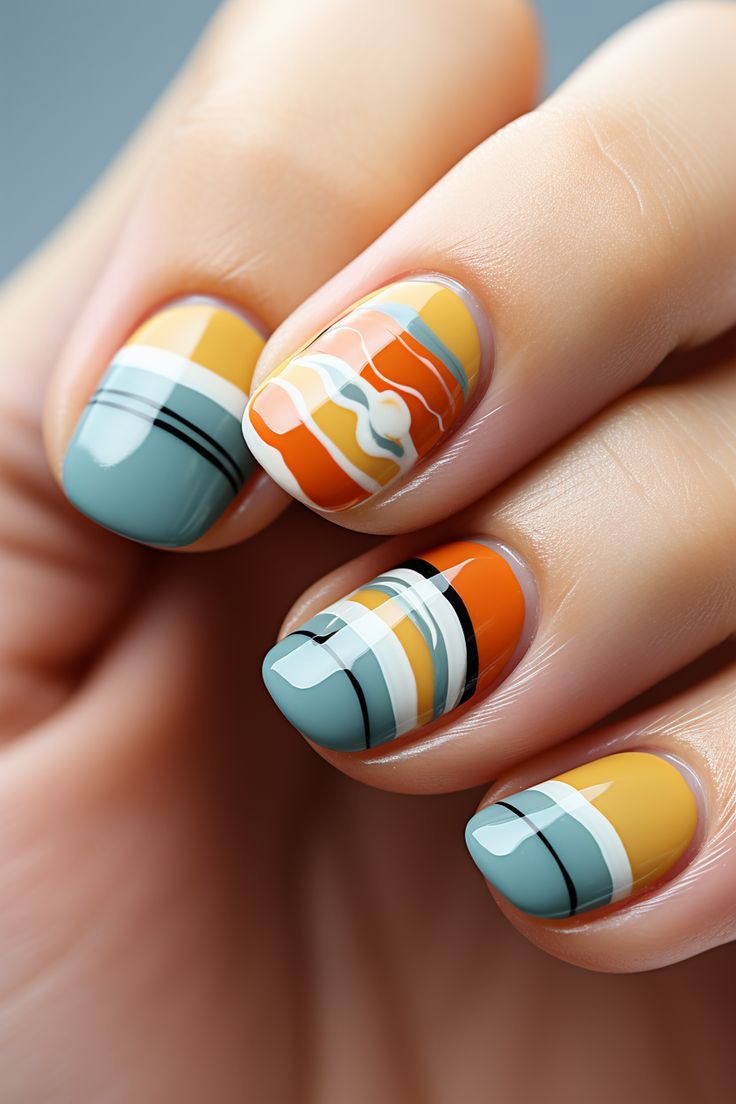 - Professional Opinion: The playful juxtaposition of mustard, white, orange, and cool blue hues captures a 70s beach palette, making a bold statement. What’s special about these summer vacation nails short is the way they combine nostalgia with a sleek, contemporary finish, suitable for any summer vacation nails beach simple outing.