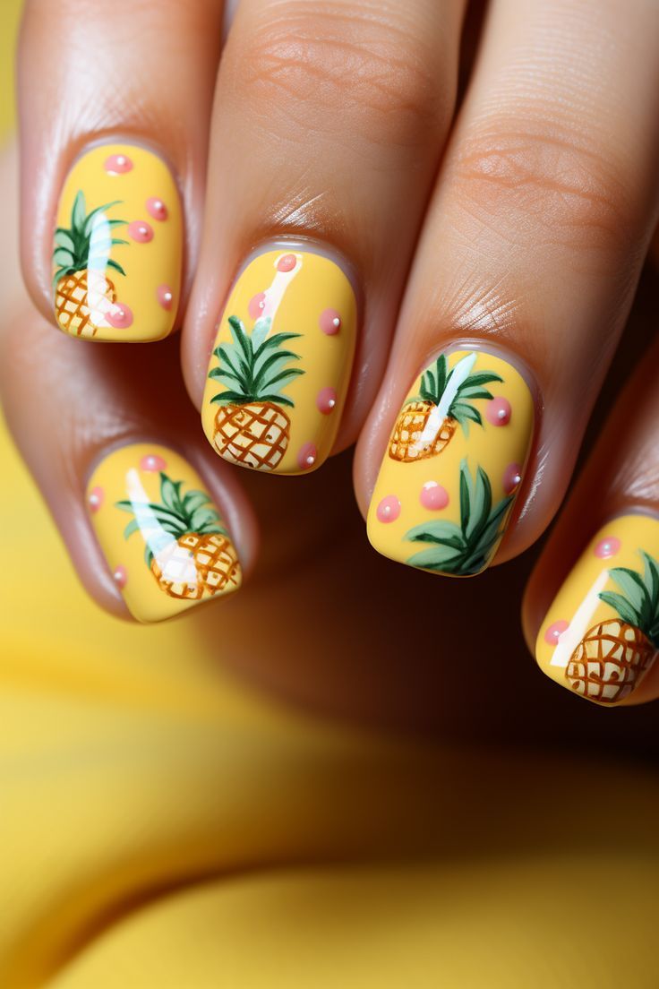 - DIY Tips: Lay down your yellow base, then with a fine brush, draw your pineapples. A dotting tool will give you the perfect polka dots. Take your time with the details—patience will pay off with a festive and fun summer vacation nail ideas.