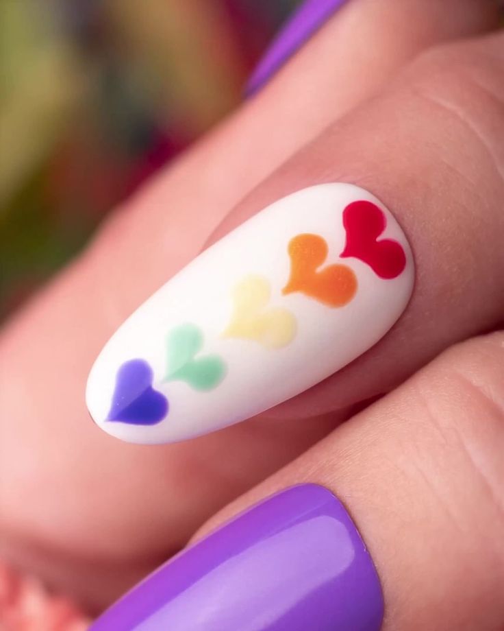 Ending on a vibrant note, these pride nails celebrate love with rainbow-colored hearts. This design is a joyful expression of the pride movement, suitable for pride nails simple.