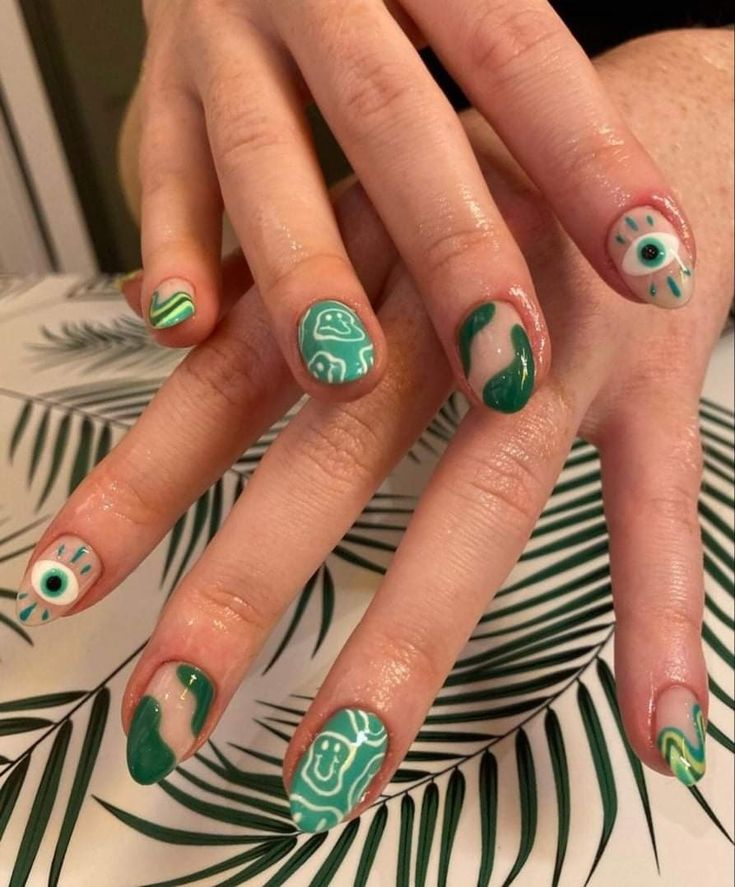 With a touch of tropical patterns and the intrigue of the evil eye, these nails speak of a story that stretches from the deep green forests to the azure depths of the sea—a perfect homage to pride nails bisexual diversity and depth.