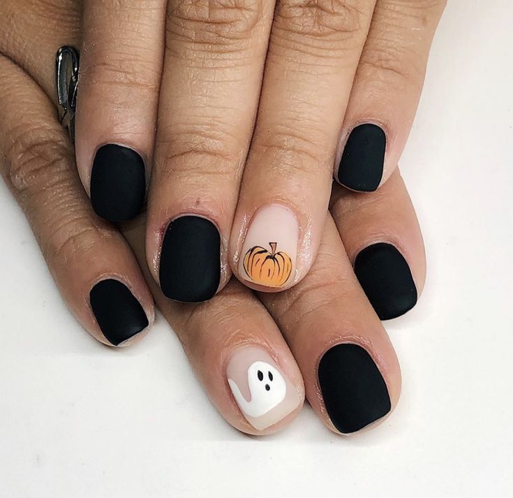 Imagine the stroke of midnight enveloping your nails, each one a canvas of obsidian velvet. In this design, the inky black takes center stage, providing a backdrop for a single nail featuring the whimsical charm of a pumpkin and a friendly ghost. This blend captures the essence of pride nails designs simple yet speaks volumes about the wearer’s playfulness and willingness to stand out.
