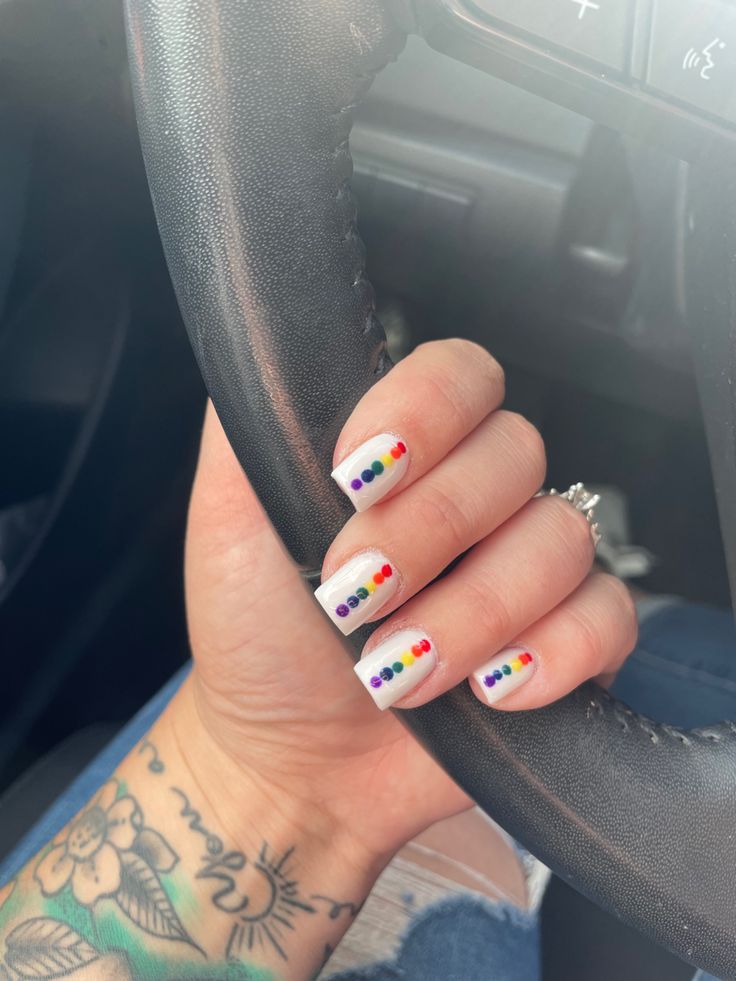 These pride nails feature a playful array of rainbow dots on a black base, perfect for those who prefer pride nails designs acrylic. The dots can be adapted to any nail shape and size, making it a versatile choice for all.