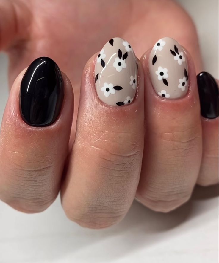Envision a midnight garden under the moon’s soft glow, where flowers bloom in shades of ivory against a night sky. This is the artistic vision brought to life on these nails. On either side, we find deep black nails, glossy as the serene night. The center stage is held by nails adorned with monochrome floral patterns, delicate flowers interspersed with dark leaves on a nude.