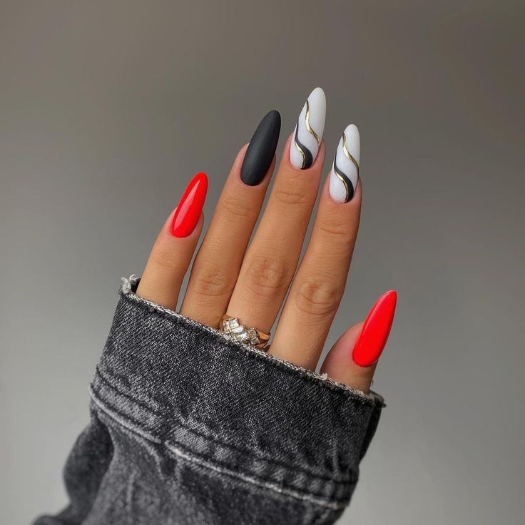 Embrace the dramatic flair of April with a bold contrast of matte black, glossy white, and vibrant red. This design features a striking interplay of colors and finishes, with an abstract white and black design creating a modern art vibe. It is an ode to the unexpected surprises that the month brings, manifesting in a nail design that’s both edgy and sophisticated.