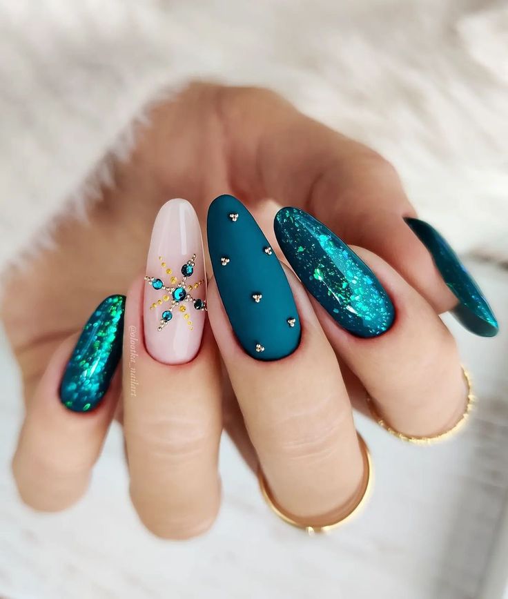 To achieve this deep oceanic look, a teal polish like OPI’s Amazon…Amazoff provides the perfect canvas, while a glitter polish such as OPI’s Turquoise Aesthetic adds the dazzling effect. Small rhinestones can be meticulously placed using a dotting tool and finished with a top coat for extra longevity and shine.