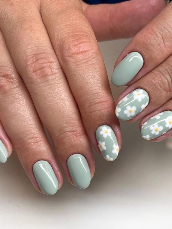 As the fresh buds bloom and the spring air whispers, the subtle mint green nail color captures the essence of April’s renewal. This delicate shade, a perfect blend of soft green with a hint of blue, provides a refreshing visual treat. Its versatility lies in its ability to complement both casual daywear and sophisticated evening attire. The nails are coated in a uniform mint base, with select fingers adorned with petite, white daisies, their yellow centers adding a playful contrast. This design not only reflects the blossoming of spring but also adds a touch of innocence and purity to your overall look.