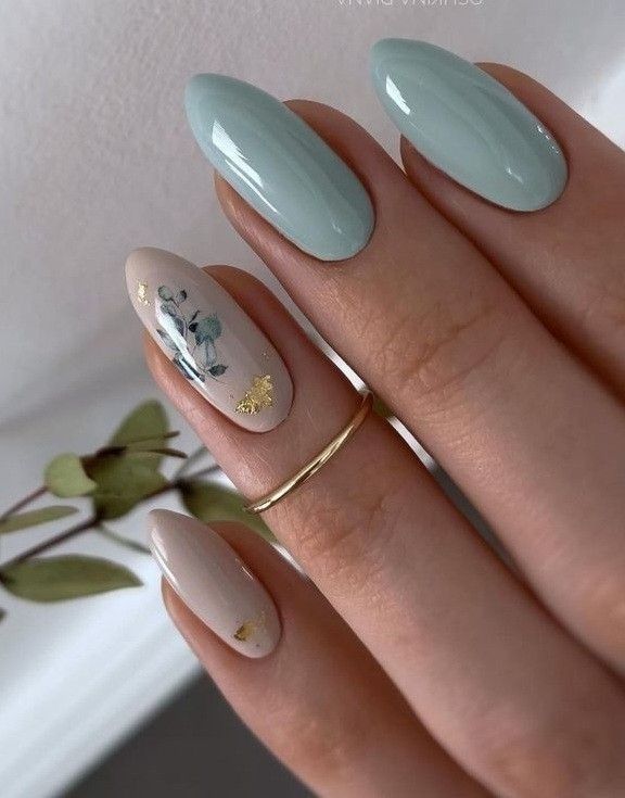 April skies are replicated on your fingertips with a serene combination of pastel blue and cloud-like white gradients, crowned with a touch of gold leaf for a glamorous twist. The almond-shaped nails are painted in a soft pastel blue, reminiscent of a clear April morning. A gradient effect fades into white, like clouds dispersing in the sky, with delicate gold leaf accents representing the glint of the sun. This design is a poetic tribute to the tranquil beauty of early spring mornings.