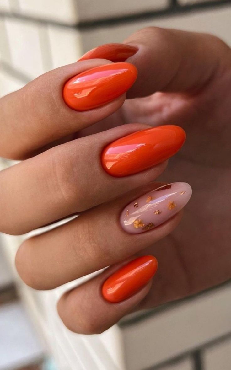 Bright and bold, this nail design is a burst of citrus delight, with a juicy orange hue that’s sure to stand out. One accent nail is adorned with gold flakes, adding an element of luxury to the lively color. This design is for the bold at heart, who wish to carry the energy of the sun on their fingertips.