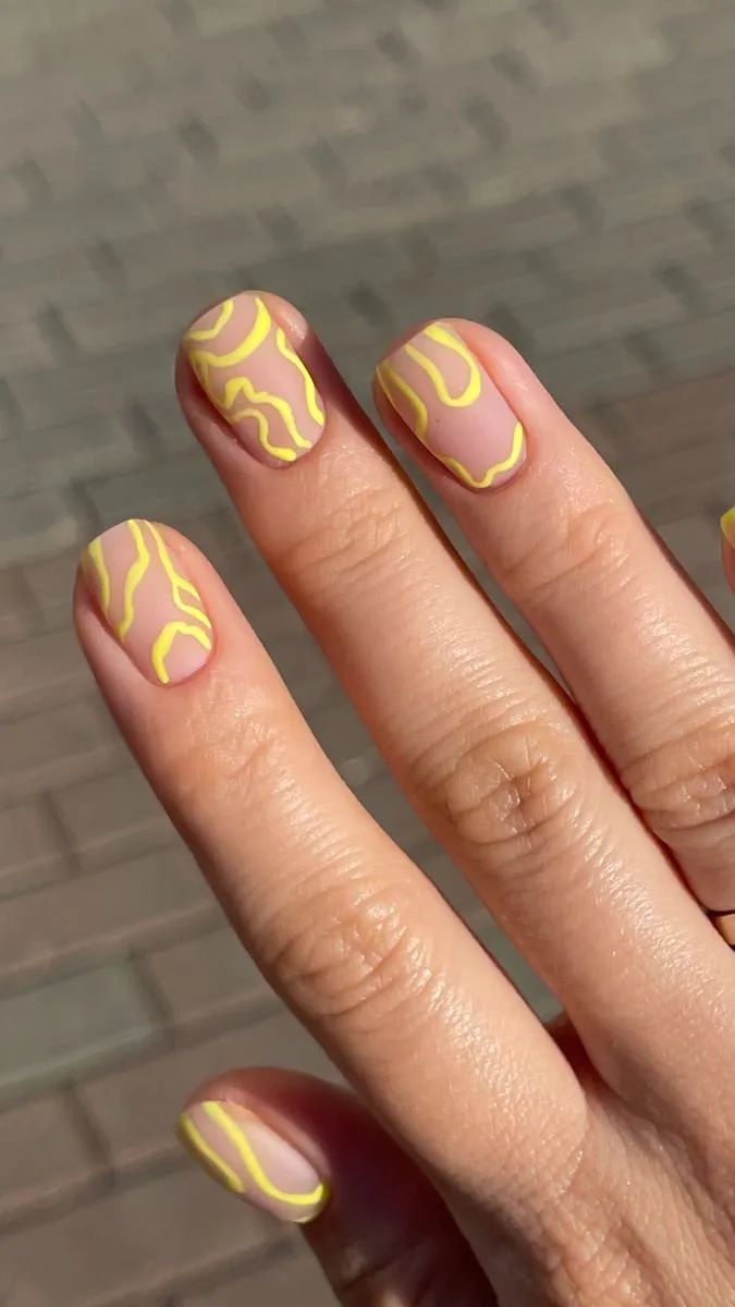 The nails depicted in photo are a true throwback to the groovy vibes with their mellow yellow tones and abstract marbling. The organic shapes in a brighter highlight create a beautiful contrast, perfect for those breezy beach days or laid-back evenings at a jazz bar. It’s a nails inspiration vocation moment, capturing the essence of relaxed summer days.