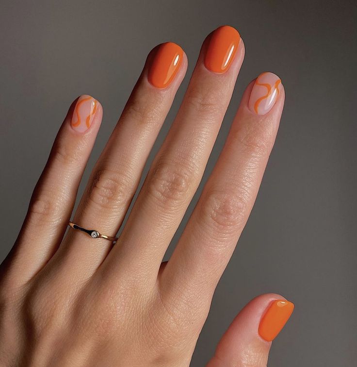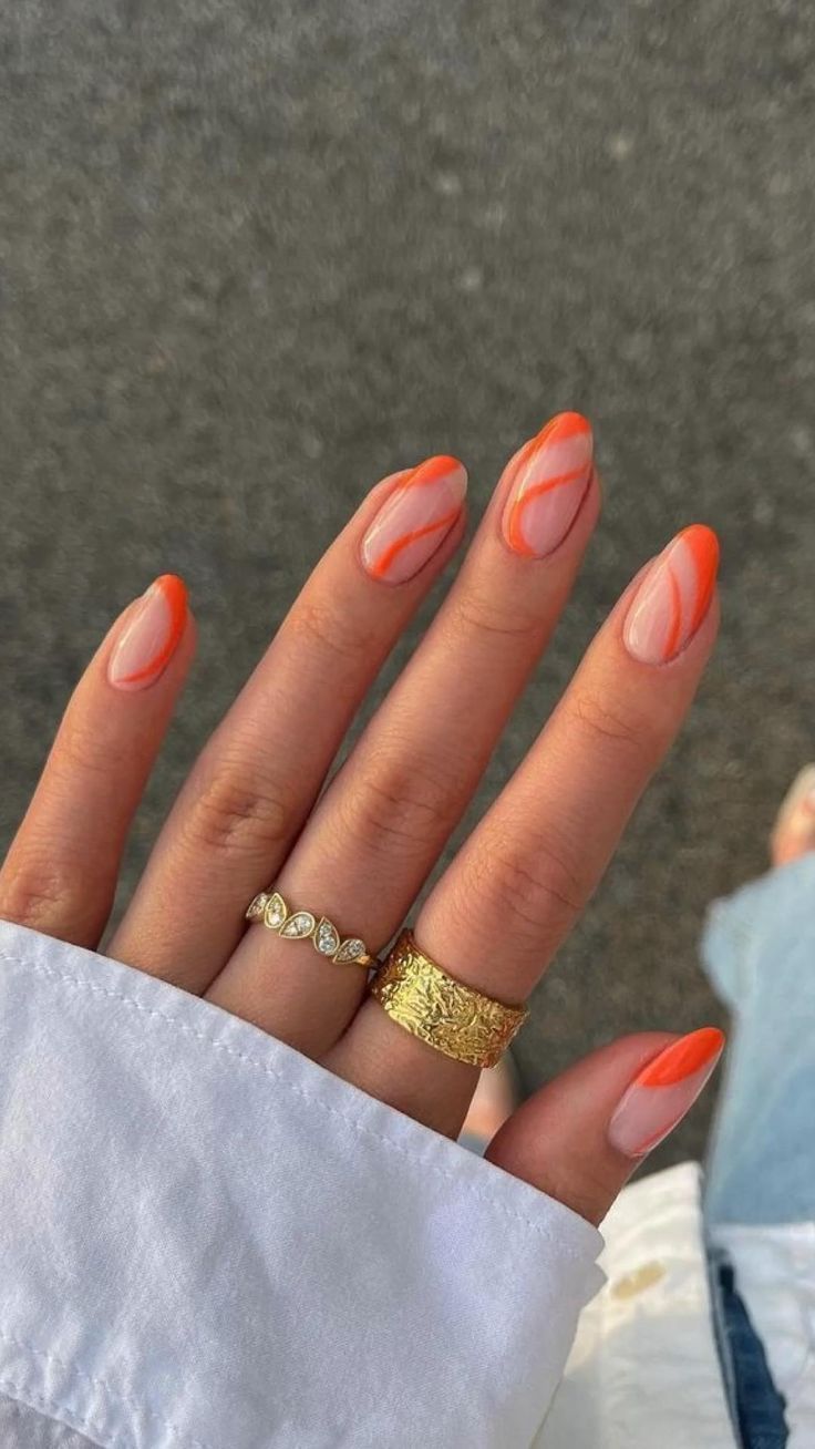 Embracing the vibrancy of summer, the nails in photo feature a juicy orange hue with white swirl accents, reminiscent of a refreshing citrus twist. These nails are for the lively spirit, the one who finds joy in the simple pleasures of life and whose presence is as invigorating as a summer breeze.