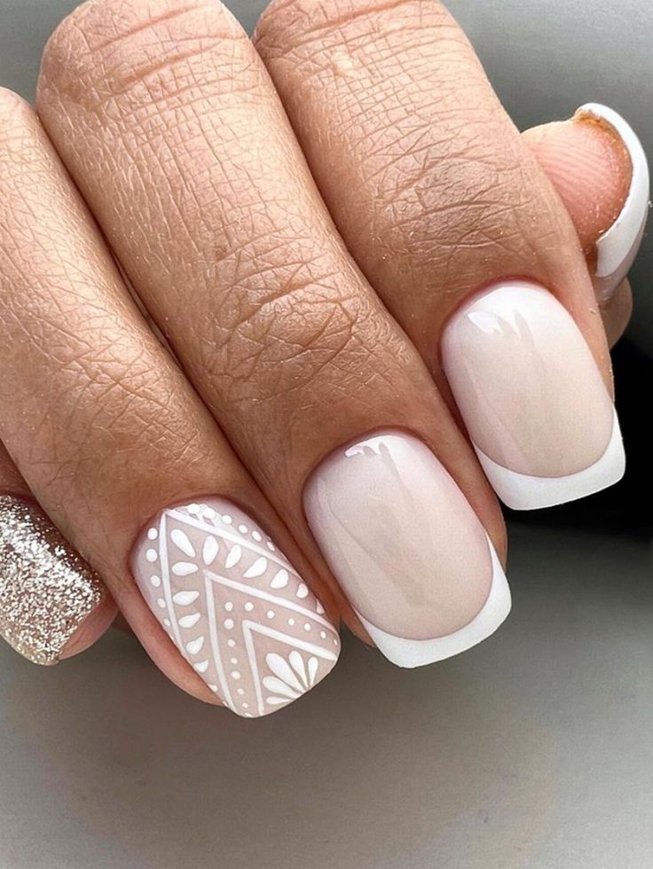 The photo takes us on a journey to the heart of tribal chic with a nail design that’s both bold and intricate. The combination of a creamy nude base with a detailed white tribal print is powerful and grounding. These nails are for the woman who is not only exploring new geographies on her vacation but is also on an expedition of self-discovery.