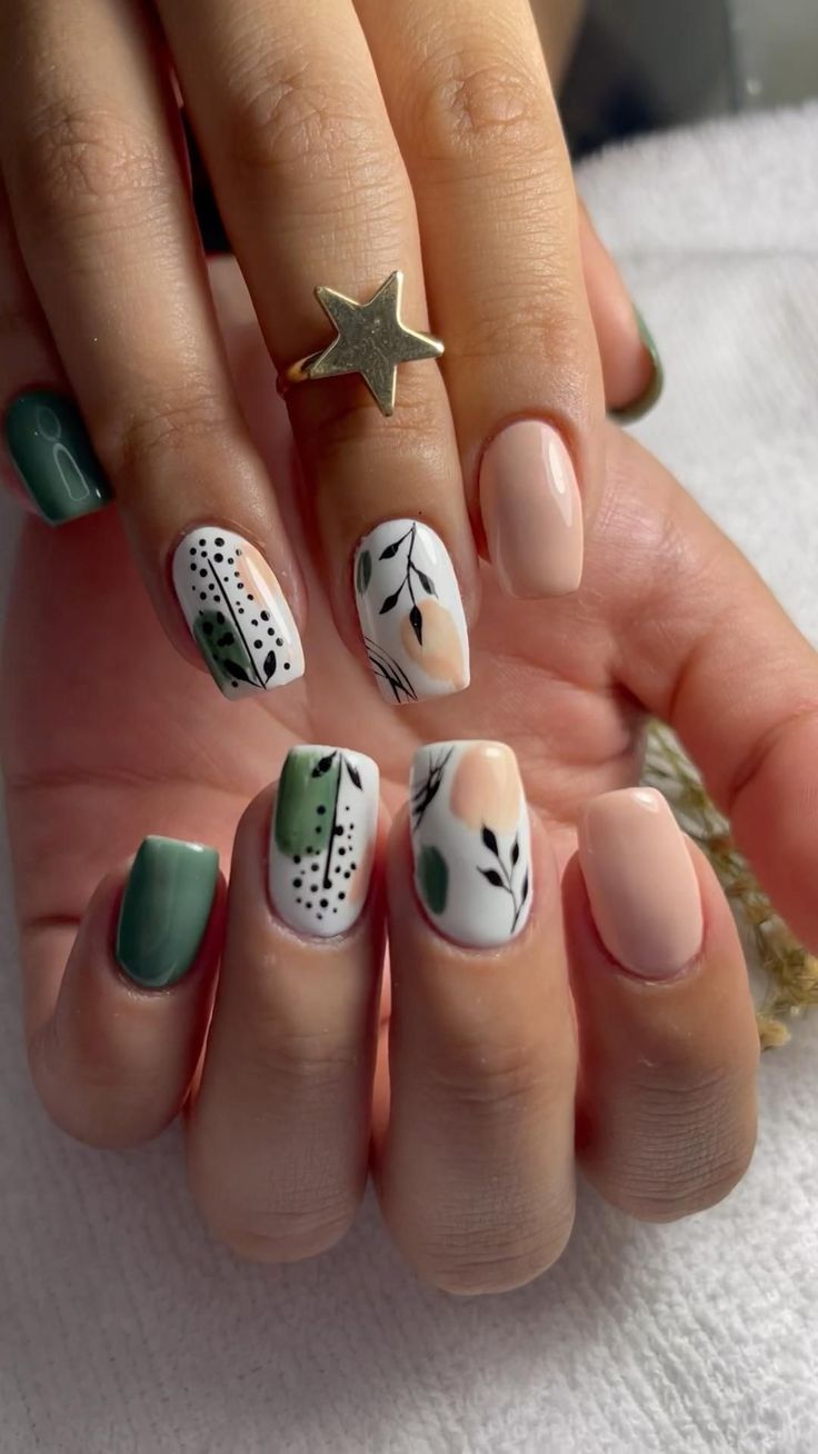 The nails in photo are a fusion of flora and fauna, with their green hues and nature-inspired designs. They speak of a deep connection with the earth, ideal for the eco-conscious traveler. These nails are perfect for the woman who finds solace in the rustling leaves and the quiet streams, whose vacation is a retreat into nature’s embrace.