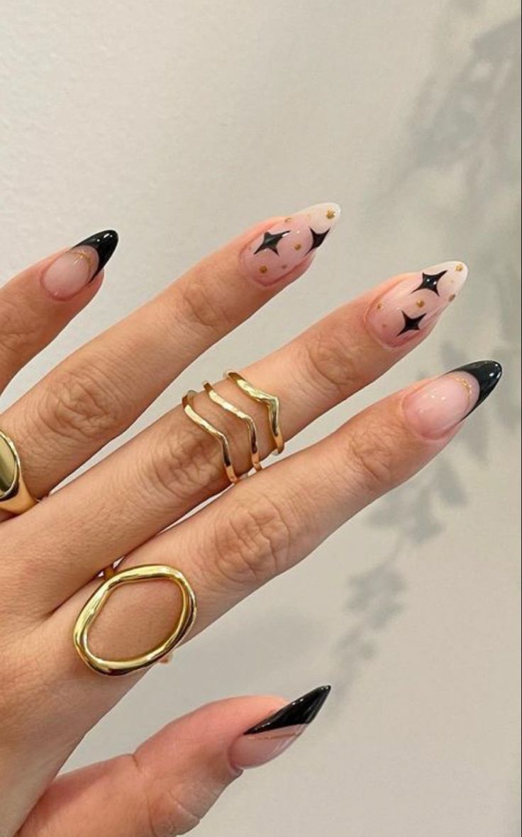 The nails in transport you to a starlit beach with their whimsical design. They encapsulate the summer nails vocation vibe, featuring a blush pink base with black tips, adorned with playful star and gold accents. This design is for the dreamer, the one who loves to gaze at the stars and make a wish on a shooting star.