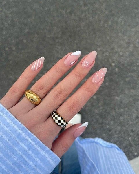 Polka dots and stripes in picture bring a playful yet chic element to vacation nails. The soft pink base with bold patterns offers a retro vibe, perfect for the woman who loves to play homage to classic styles with a modern twist. Whether you’re on a vintage shopping spree or a modern city tour, these nails are your perfect companion.