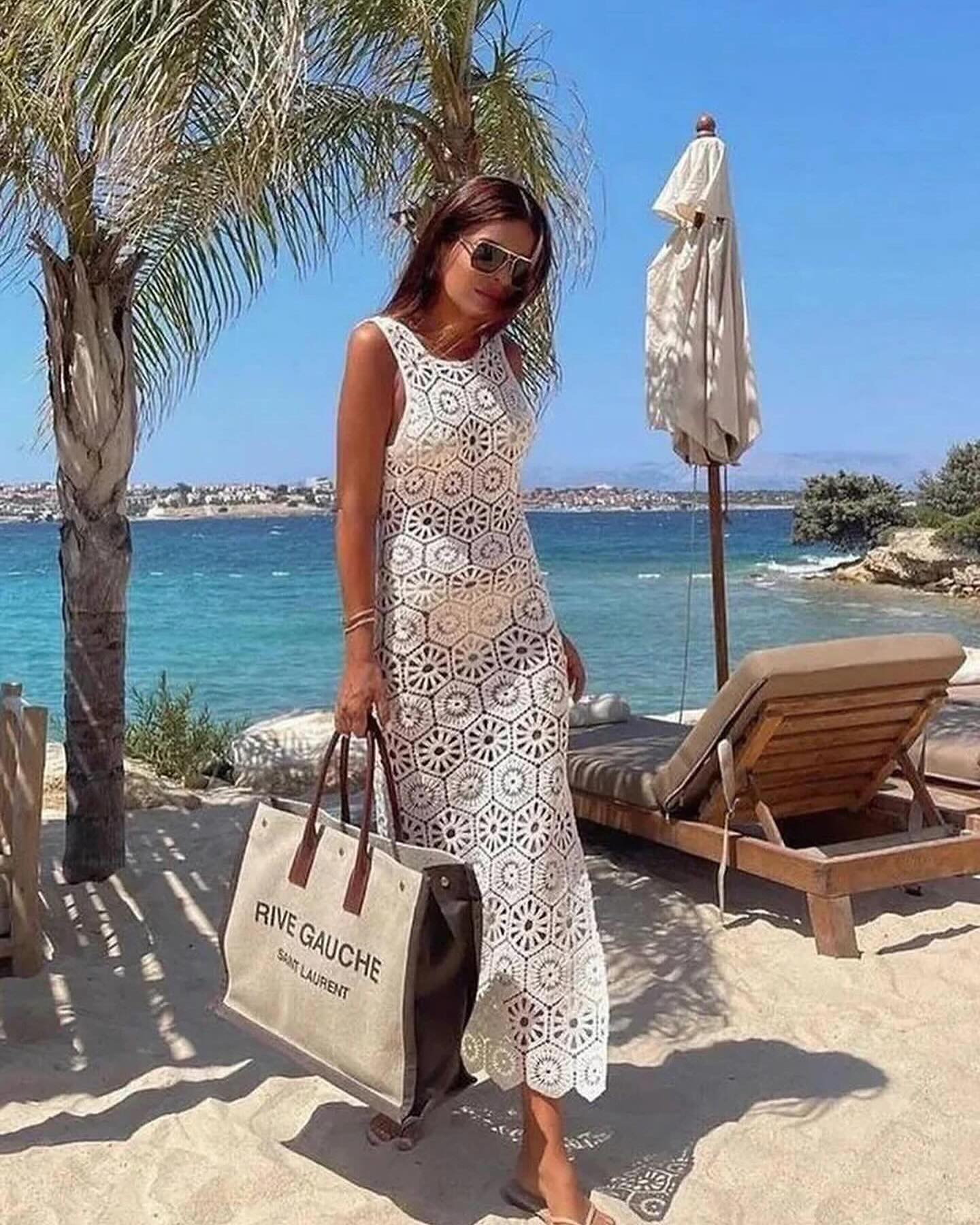 Tapping into the minimalist charm of Korean fashion, this sleeveless crochet dress stands out in its geometric intricacy and understated elegance. The clean lines and neutral palette make it a versatile piece for comfy casual summer outfits. It’s a celebration of both form and function, suited for a variety of body types.