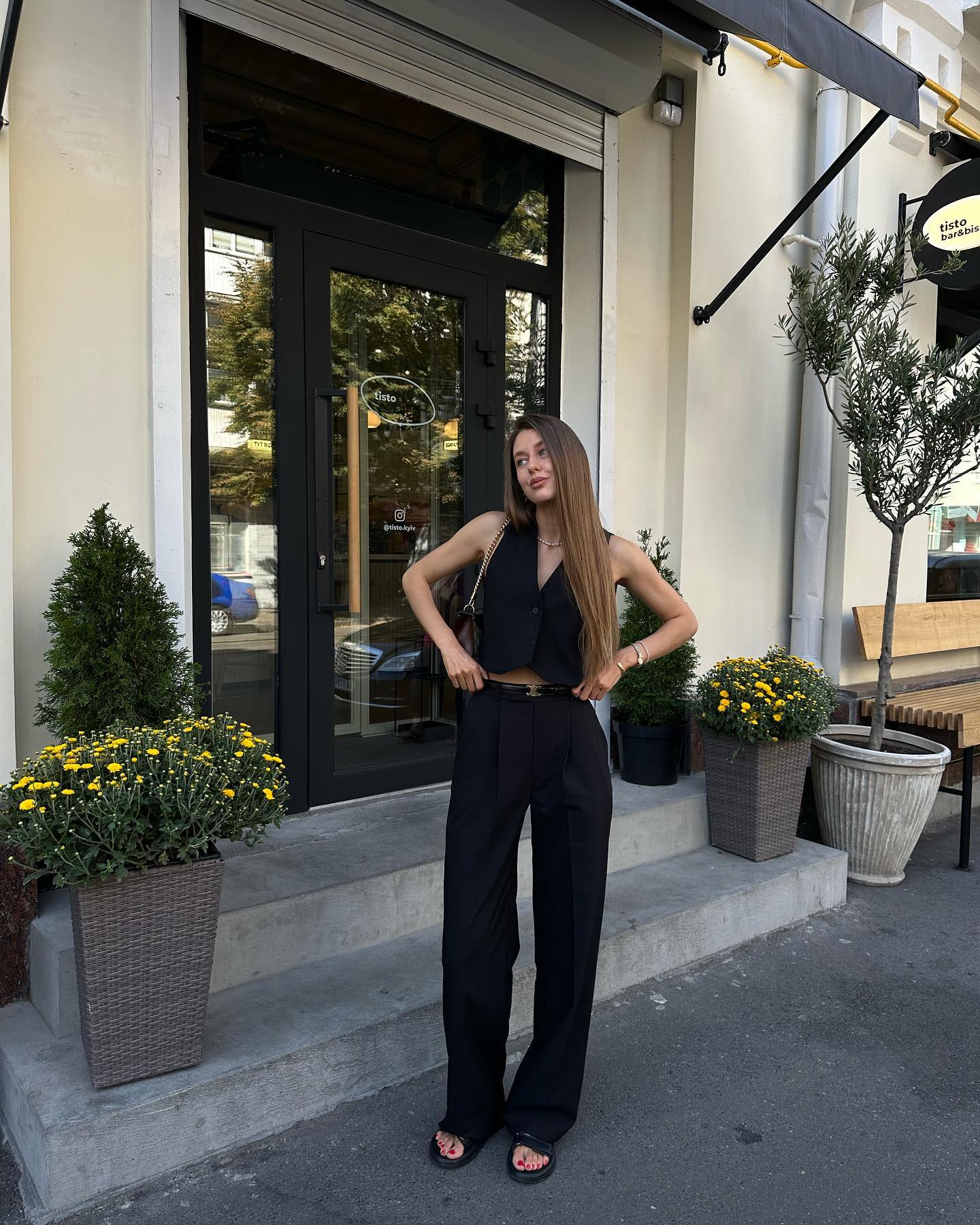 Minimalist Sandals: Subtly enhance the outfit’s vertical lines.