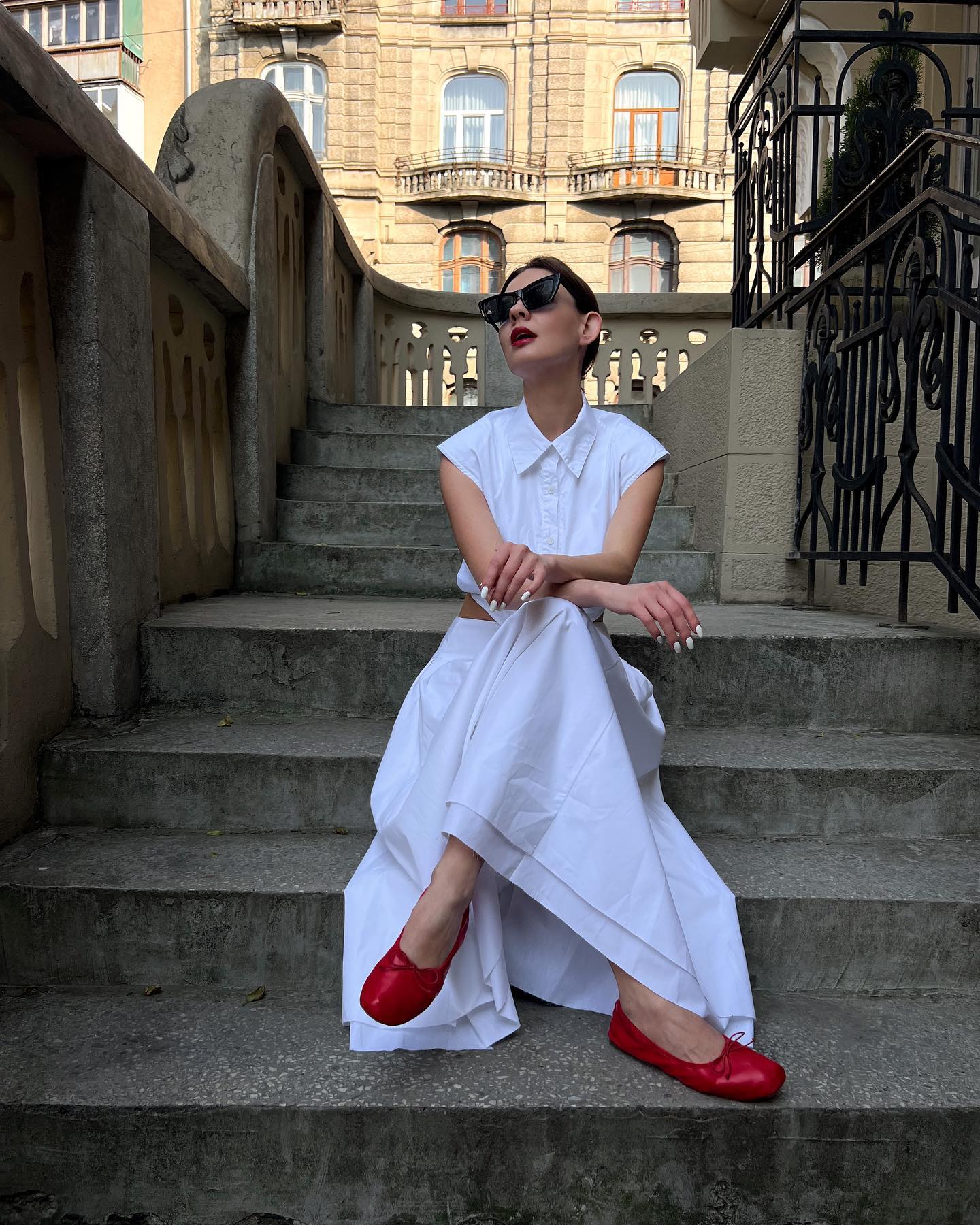 Bold Red Flats: A delightful surprise that adds a dash of fun to the serious white.
