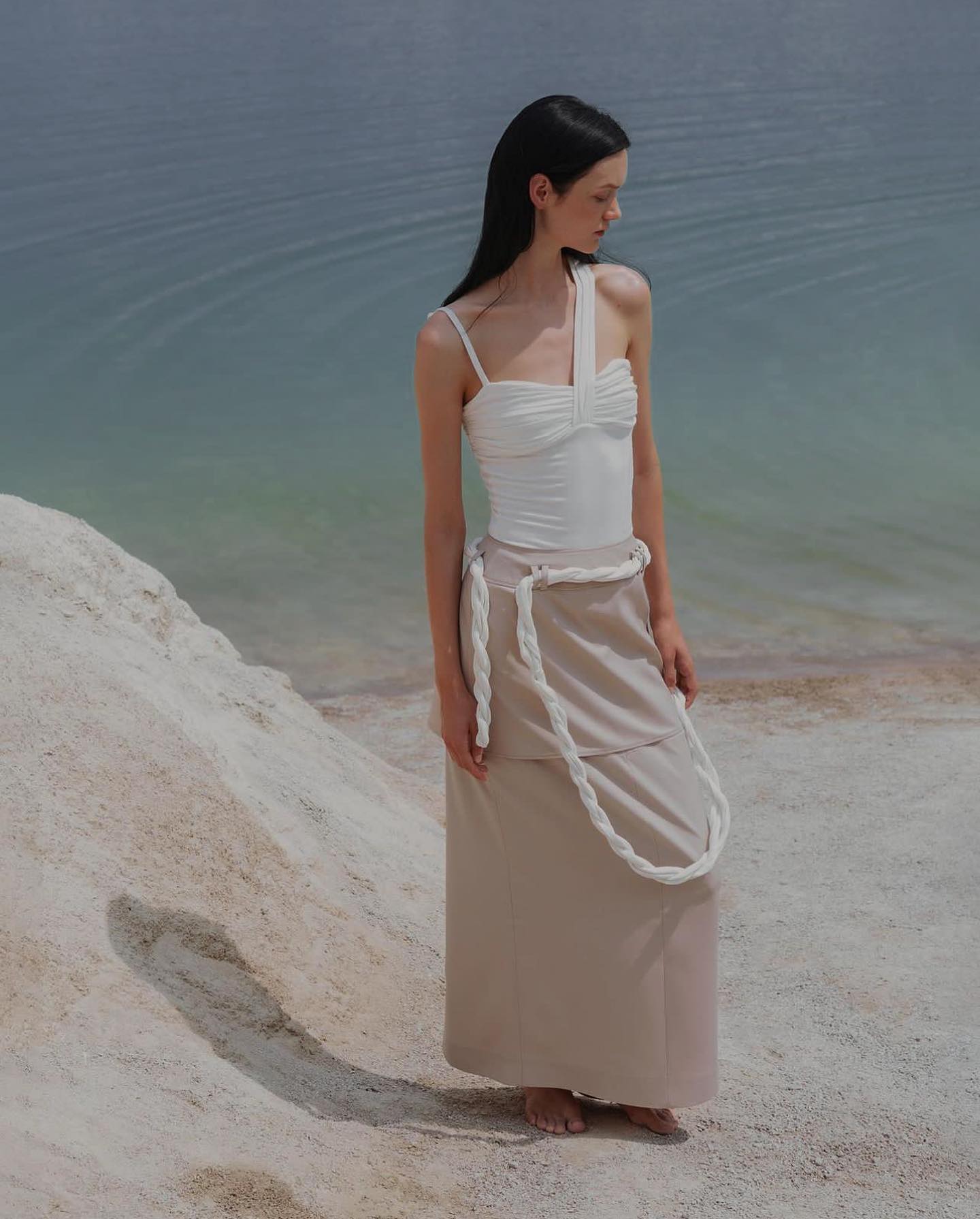 Relaxed-Fit Skirt: The flowing lines and neutral color maintain a sense of calm and ease.