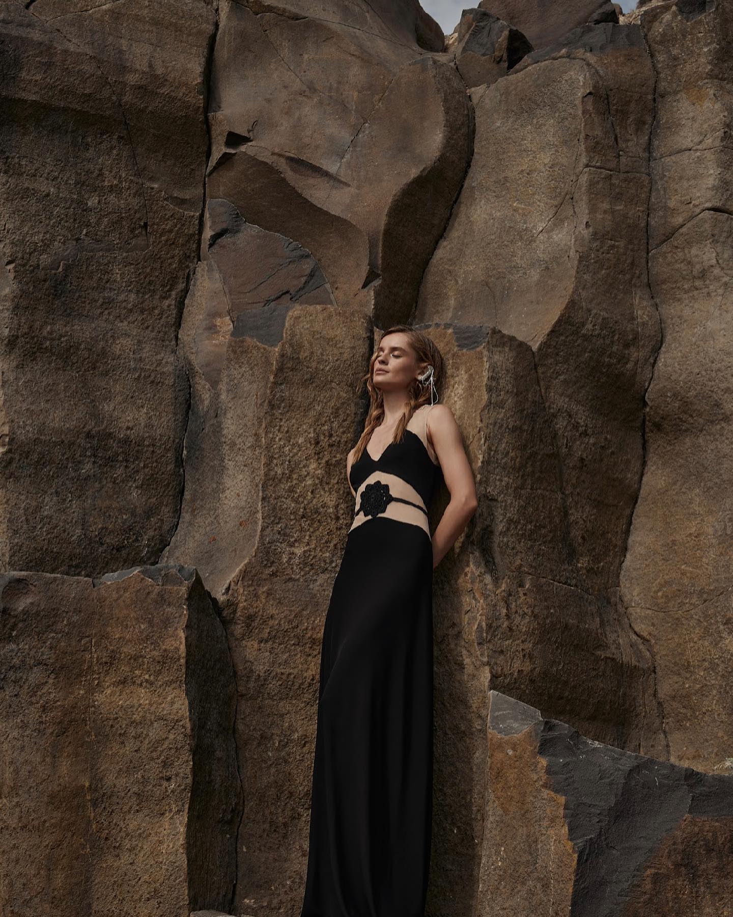 Here’s a comfy casual summer outfit that’s as timeless as the rock formations it’s set against. This black dress with lace detailing is sophistication personified—perfect for an upscale evening event where making a bold yet refined statement is key.