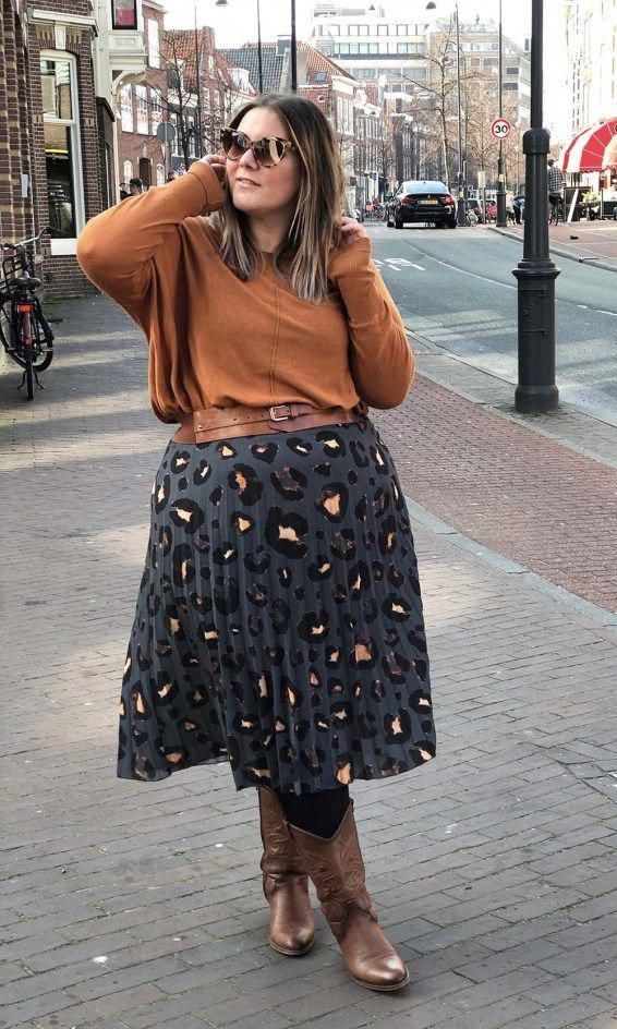 Вбрання в стилі бохо зі светром кольору іржі та спідницею з візерунком передає суть весни. Цей образ ідеально підходить для повних жінок, які люблять заявляти про себе за допомогою одягу, втілюючи вільний та невимушений настрій.