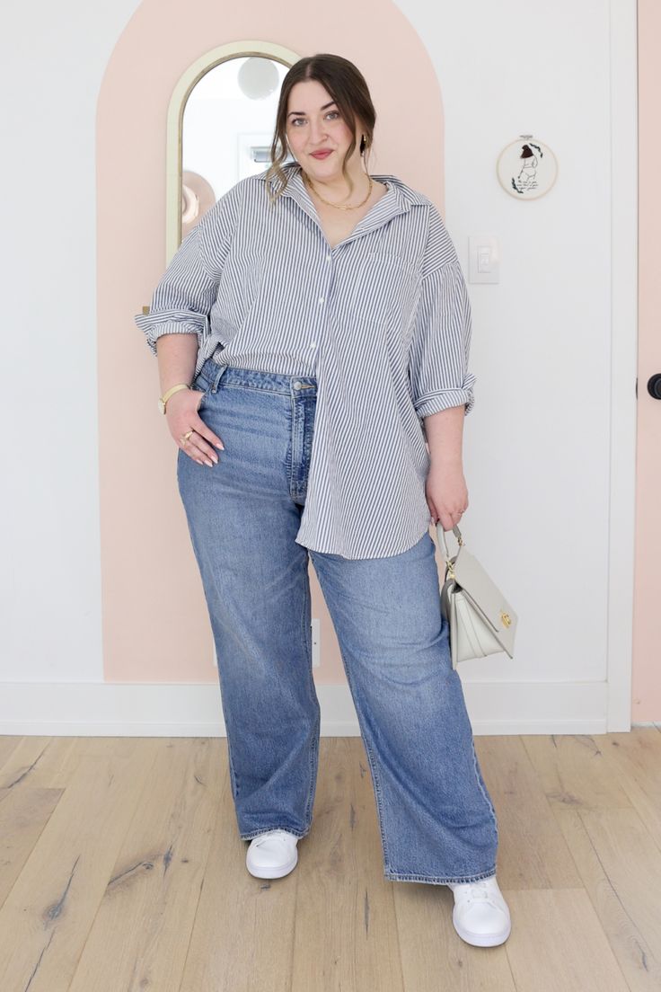 Смугаста сорочка оверсайз у поєднанні з широкими джинсами – це ідеальний варіант весняного вбрання плюс комфорт повсякденних джинсів великого розміру. Це вільний і розслаблений образ, який ідеально підходить для відпочинку або для повсякденних справ, втілюючи невимушений весняний дух.