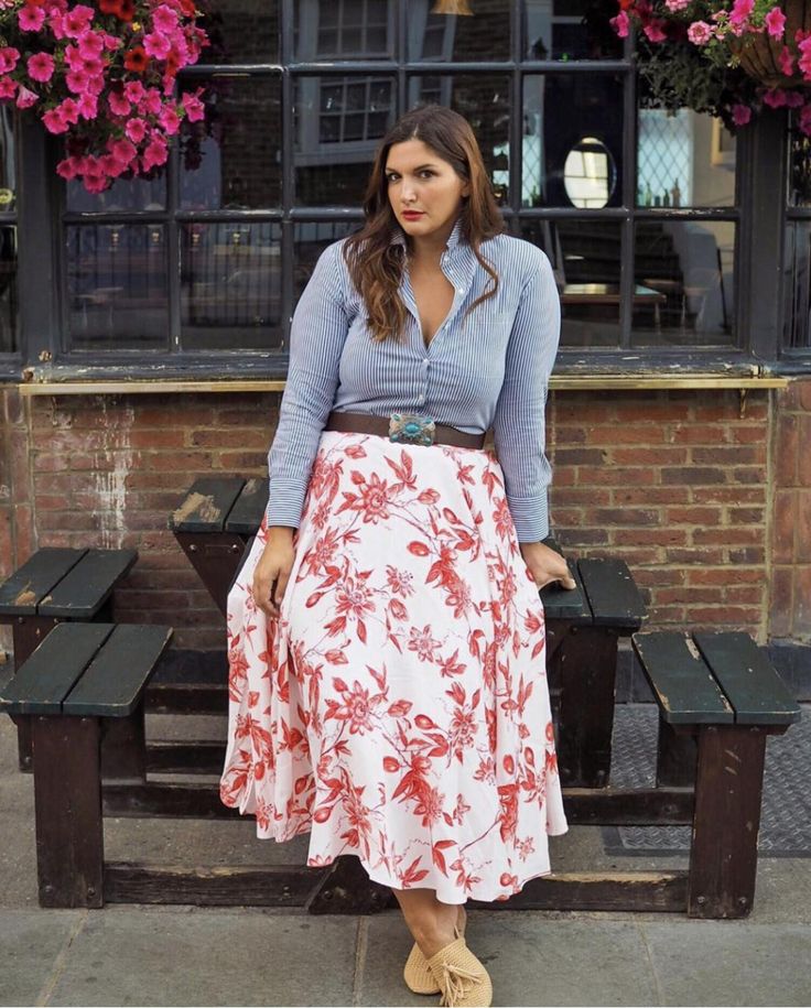 Змішування візерунків може бути зухвалим, але коли все зроблено правильно – це модно. Смугаста синя сорочка, заправлена в квітчасту спідницю, доводить, що весняні вбрання плюс сайз 2024 можуть бути веселими і модними. Цей ансамбль говорить про те, що ви готові зустріти новий сезон зі стилем і впевненістю.