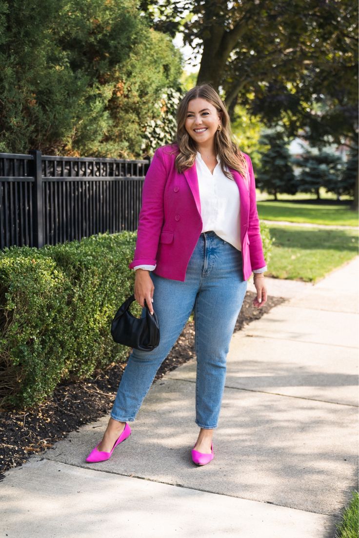 Яскраво-рожевий піджак додасть вашому гардеробу трохи грайливого кольору. У поєднанні з простою білою блузкою і повсякденними джинсами весняного крою ви отримаєте образ, одночасно професійний і енергійний, ідеальний для весняного крою і повсякденних джинсів великого розміру.