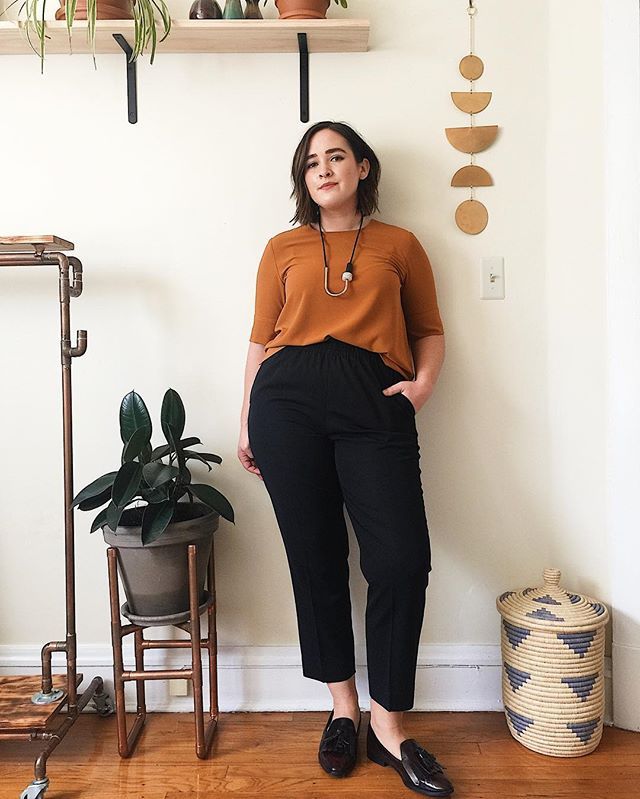 Мінімалістичний образ, що складається з топа карамельного кольору в поєднанні зі строгими чорними штанами, є прикладом весняного вбрання в стилі plus size casual. Простота ансамблю підкреслена витонченими аксесуарами, що робить його ідеальним вибором для вишуканого і водночас простого образу.