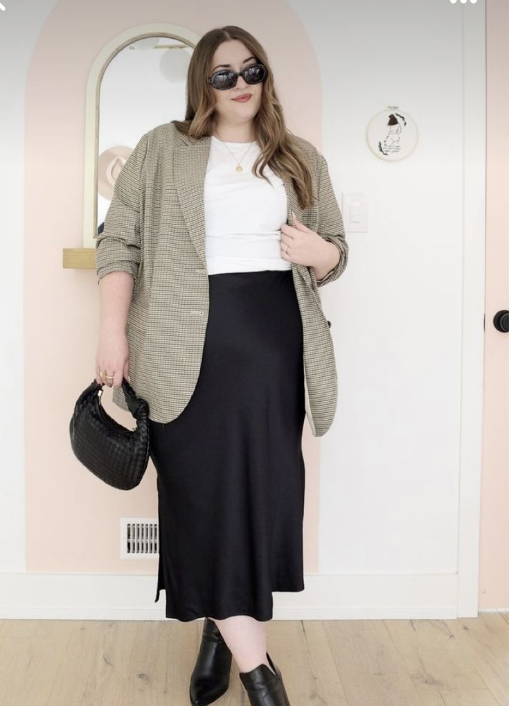 Для сучасного мінімалістичного образу білий кроп-топ у поєднанні з чорною спідницею міді та блейзером “гусяча лапка” відповідає трендам весняного вбрання 2024 року плюс сайз. Цей образ поєднує в собі простоту і вишуканість, створюючи плавний перехід від офісу до вечірнього виходу.