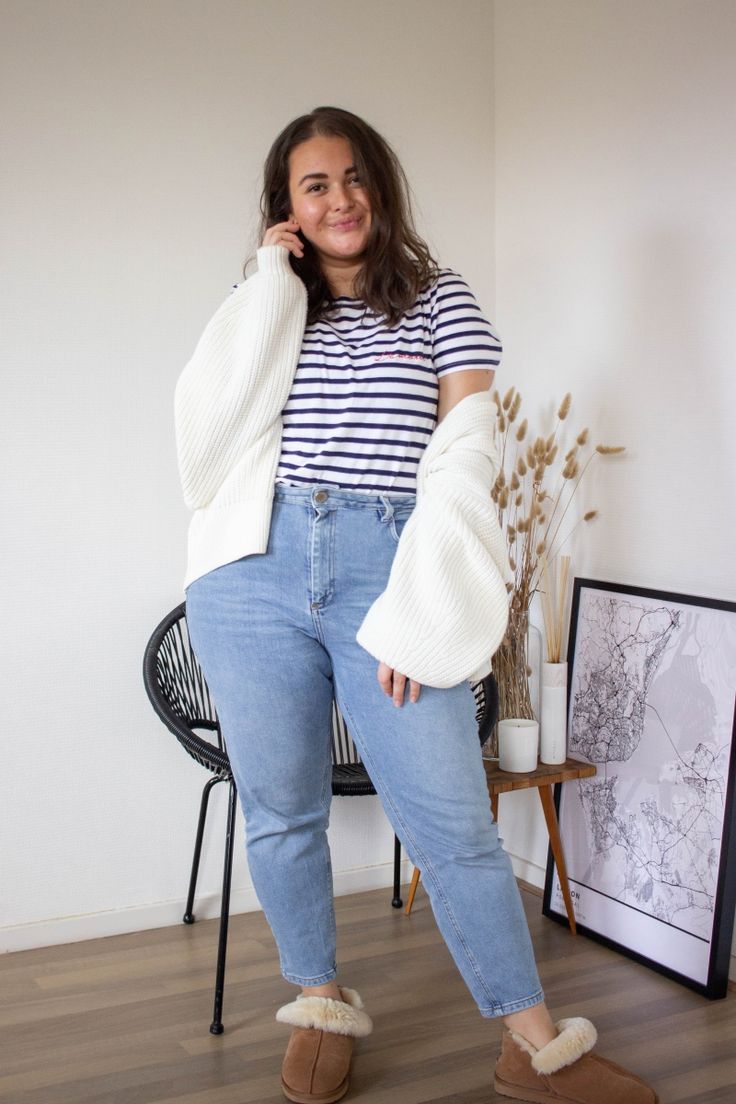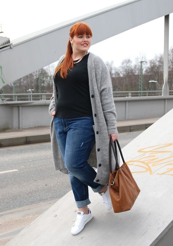Ідеальний варіант весняного вбрання для повсякденного стилю плюс сайз – товстий трикотажний кардиган, вдягнений поверх класичної смугастої футболки та світло-блакитних джинсів. Ансамбль ідеально підходить для розслаблених вихідних, пропонуючи тепло і стиль з додаванням плюшевої текстури капців.