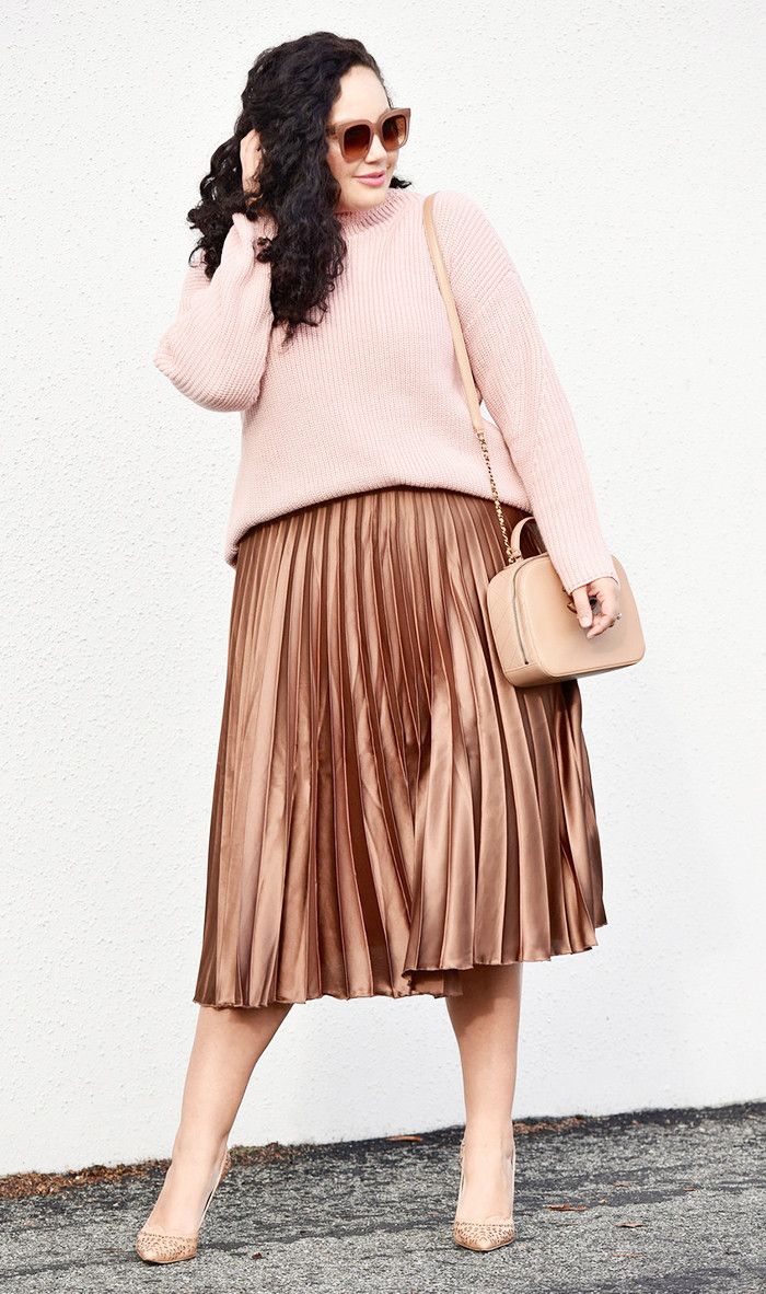 Плісировані спідниці випромінюють жіночність і можуть стати чудовим доповненням до весняних образів 2024 року в стилі plus size. М’який пастельний светр з плісированою спідницею металік поєднує в собі комфорт і гламур, підходить як для денних, так і для вечірніх заходів.