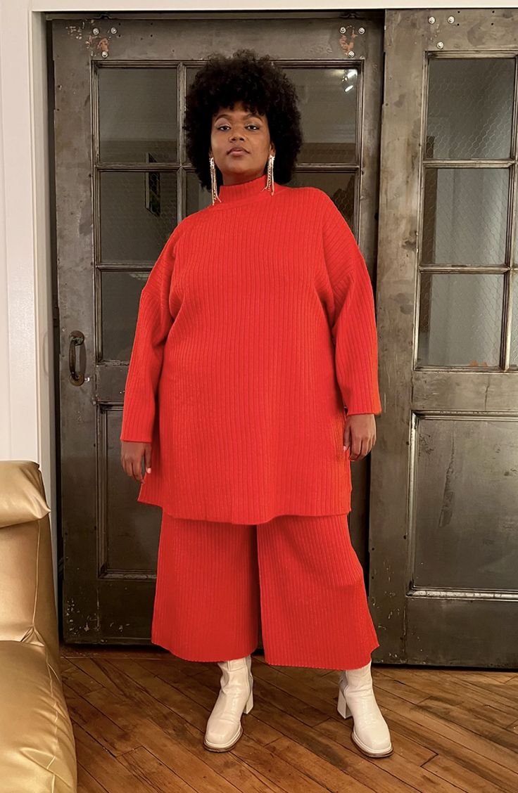 Монохромне вбрання – позачасовий тренд, який чудово підходить для весняних образів жінок з великими розмірами. Светр грубої в’язки сміливого кольору, наприклад, червоного, в поєднанні з відповідними широкими штанами створює вражаючий образ. Він простий, але гра текстури додає йому вишуканості.