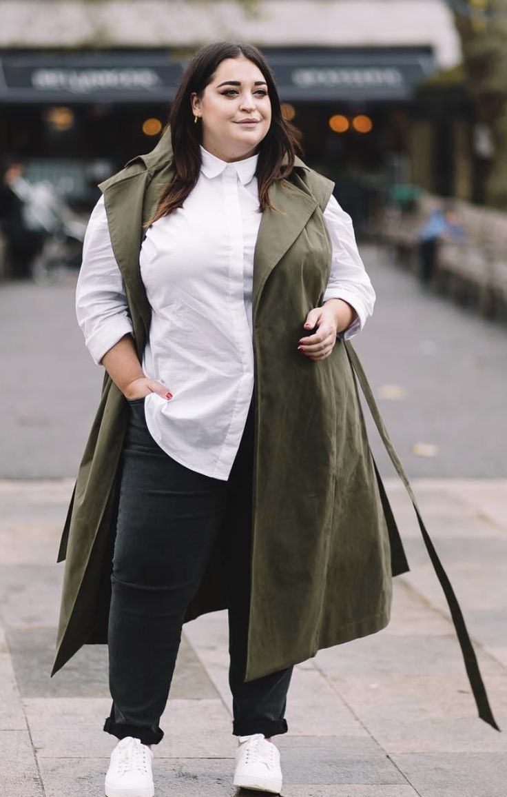 Багатошаровість актуальна не лише в холодні місяці. Легкий жилет поверх класичної білої сорочки додає вбранню глибини, водночас залишаючи його весняним і зручним для повсякденного одягу великих розмірів. Вибираючи землисті тони, такі як оливково-зелений, можна віддати належне естетиці бохо, залишаючись при цьому стриманим і витонченим.