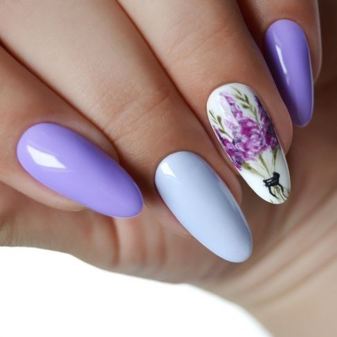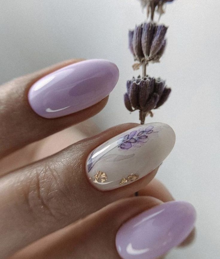 Уявіть, як кінчики ваших пальців розквітають ніжною врівноваженістю весняних лавандових полів. Цей дизайн оспівує класичні лавандові весняні нігті овальної форми, поєднуючи однотонний колір з ботанічним мистецтвом. Кожен ніготь – це окрема пелюстка, деякі з них демонструють повний лавандовий відтінок, а інші – чисте біле полотно, прикрашене гілочками лаванди, намальованими вручну. Флористичні роботи, виконані тонкими мазками, надають кожній квітці реалістичності.
