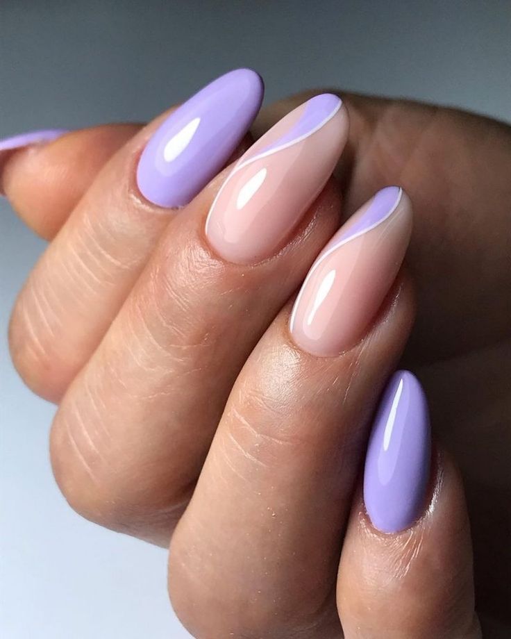 Станьте свідком м’якого градієнта раннього світанку з цими лавандовими весняними овальними нігтями. Нігті демонструють ніжний перехід від теплого нюдового до м’якого лавандового, імітуючи безтурботне небо, що зустрічає сонце. Ефект омбре – це натяк на тонкість весняного пробудження, а відтінок лаванди сигналізує про прийдешнє цвітіння.