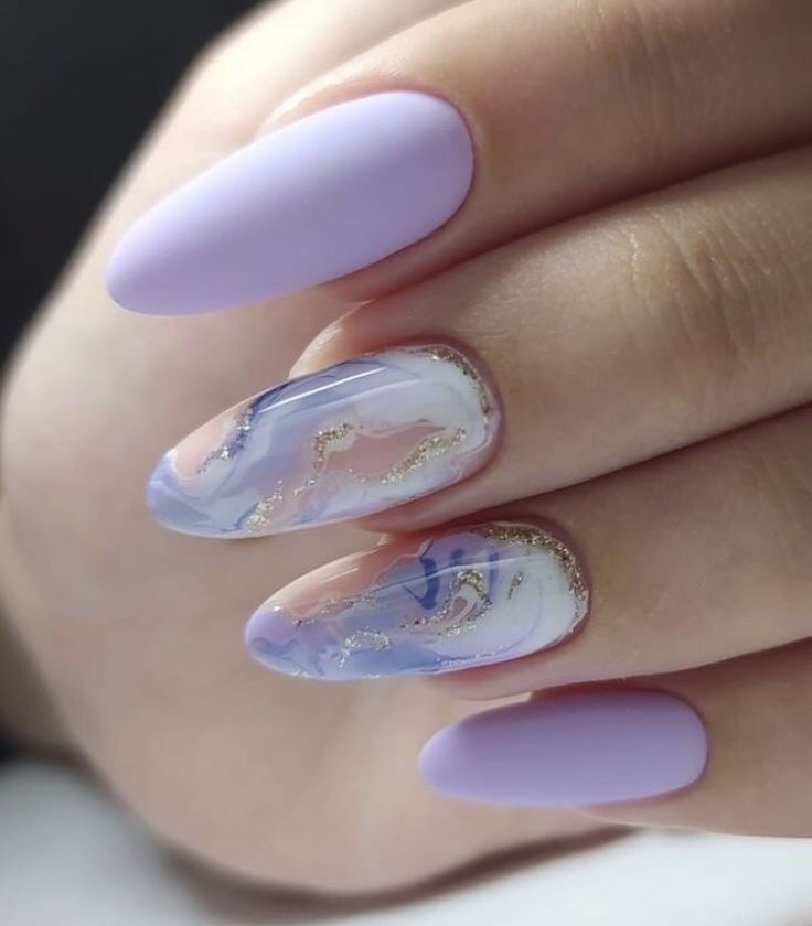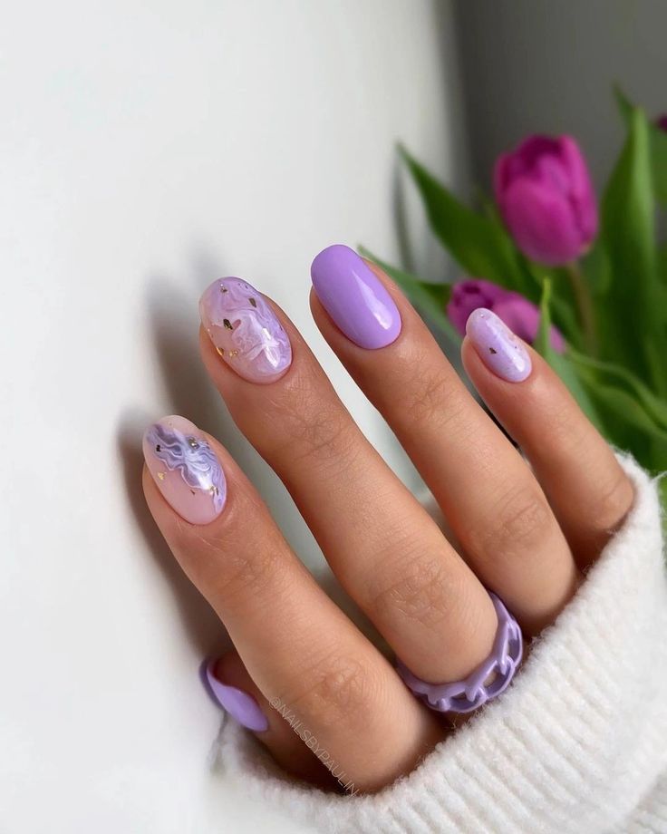 На полотні лавандових весняних коротких нігтів танець мармурового білого і лавандового кольорів займає центральне місце, підкреслений ніжними металевими прожилками. Цей дизайн натхненний розкішним мармуром старовинних палаців, осучасненим з відтінком весняної свіжості.